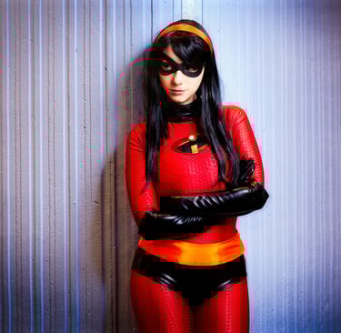 An image of one of my favorite humans, Riddl1e, in her Violet cosplay (from The Incredibles). Shot during our once annual photoshoot at DragonCon in Atlanta!